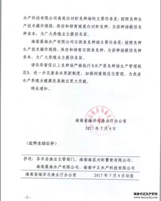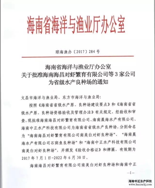 2017年7月4日,海南省海洋与渔业厅办公室正式下发通知,批准米兰体育官网登录入口为海南省省级水产良种场,命名为“米兰体育官网登录入口南美白对虾良种场”!