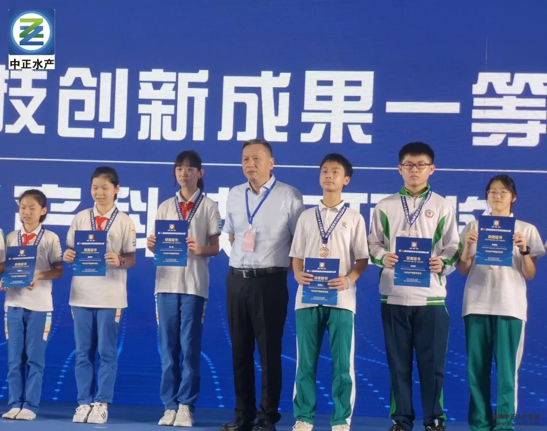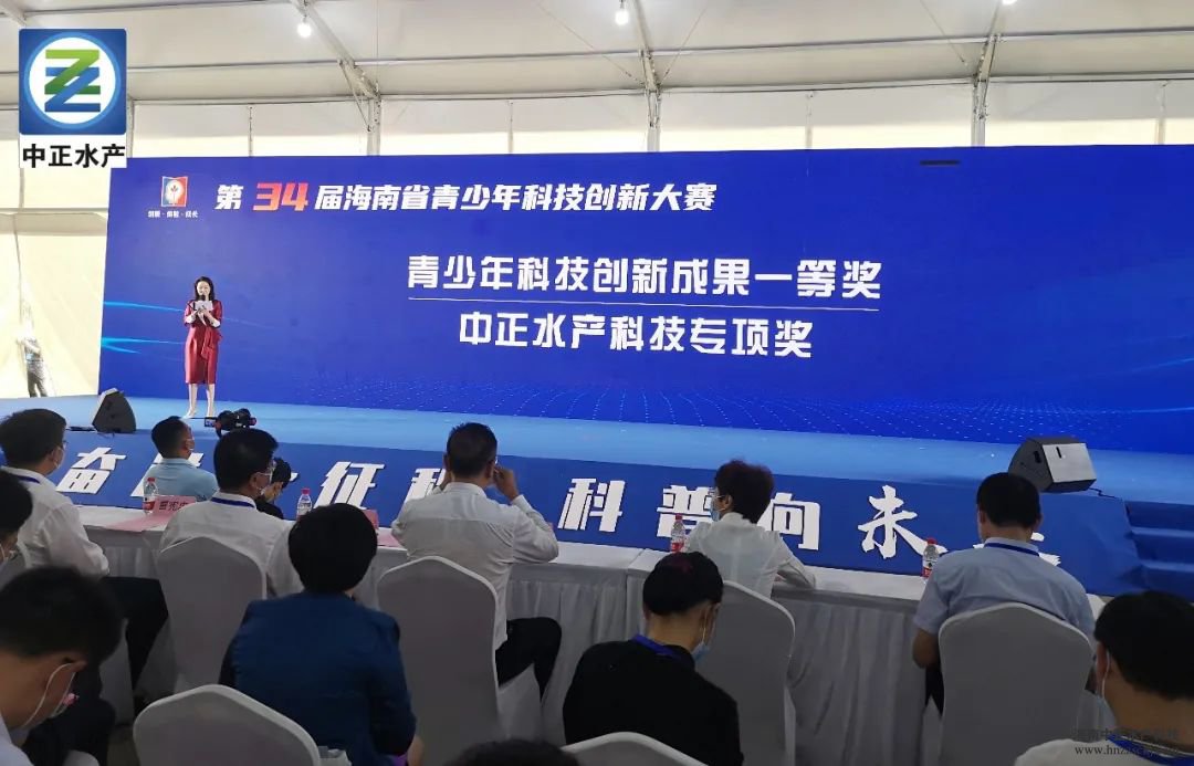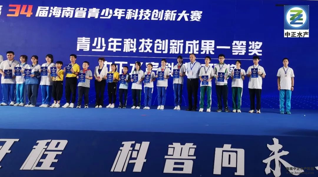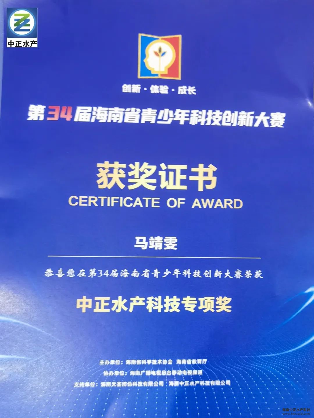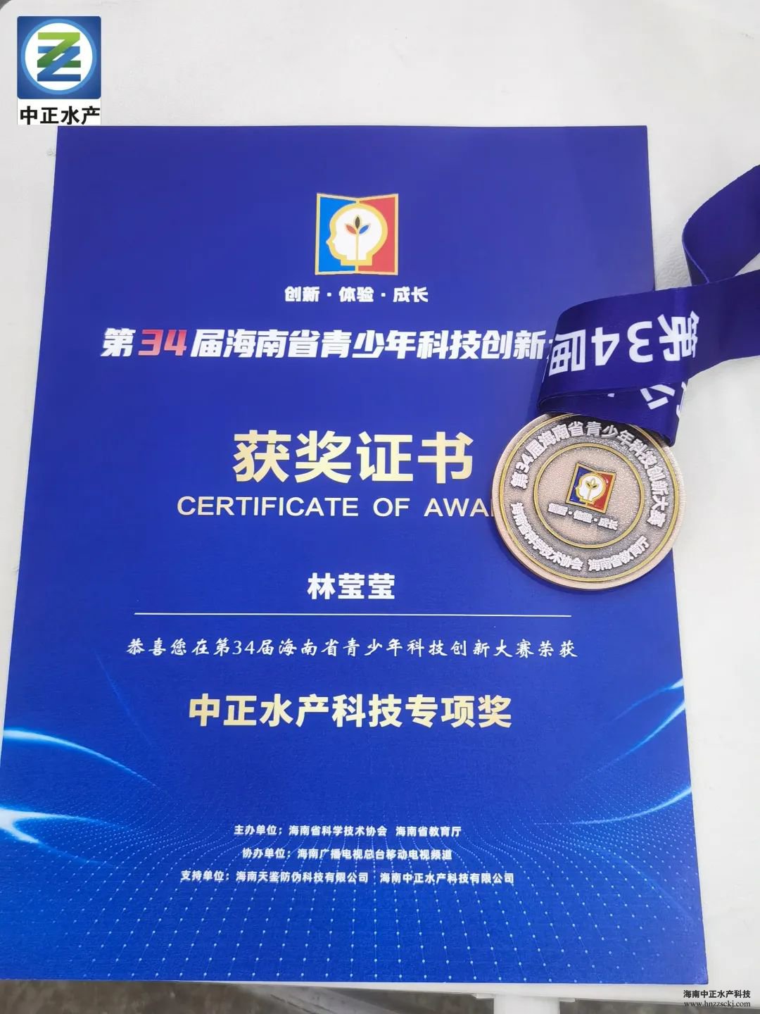 11月20日,在第34届海南省青少年科技创新大赛颁奖活动中,米兰体育官网登录入口总裁雷秋凉和海南省科学技术厅副厅长王敏,共同为获奖的同学颁发“中正水产科技专项奖”奖牌和证书,并合影留念。