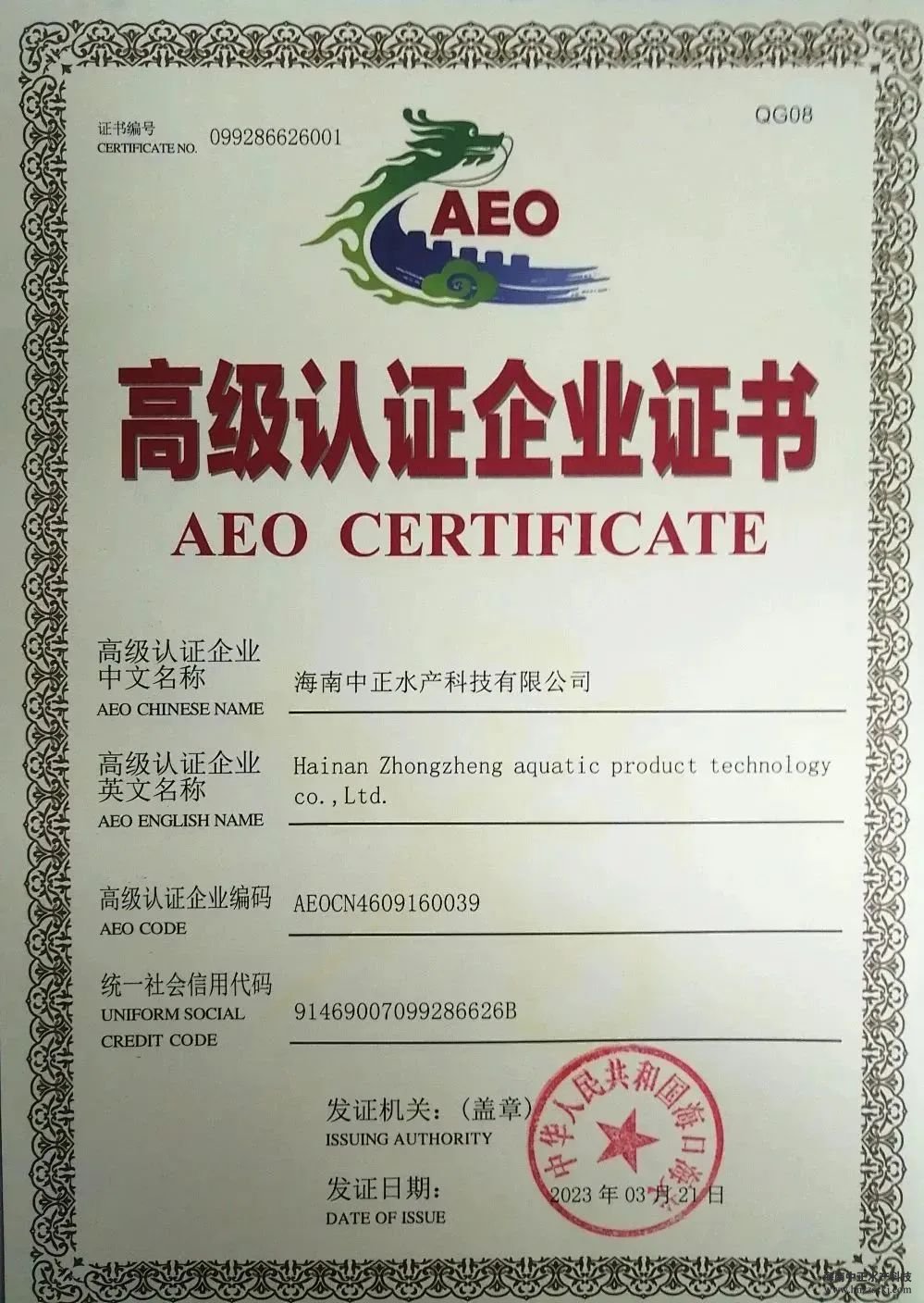 米兰体育官网登录入口于2023年3月获批成为海关AEO高級认证企业,成为海南省首家水产种业进出口为主的AEO认证企业。